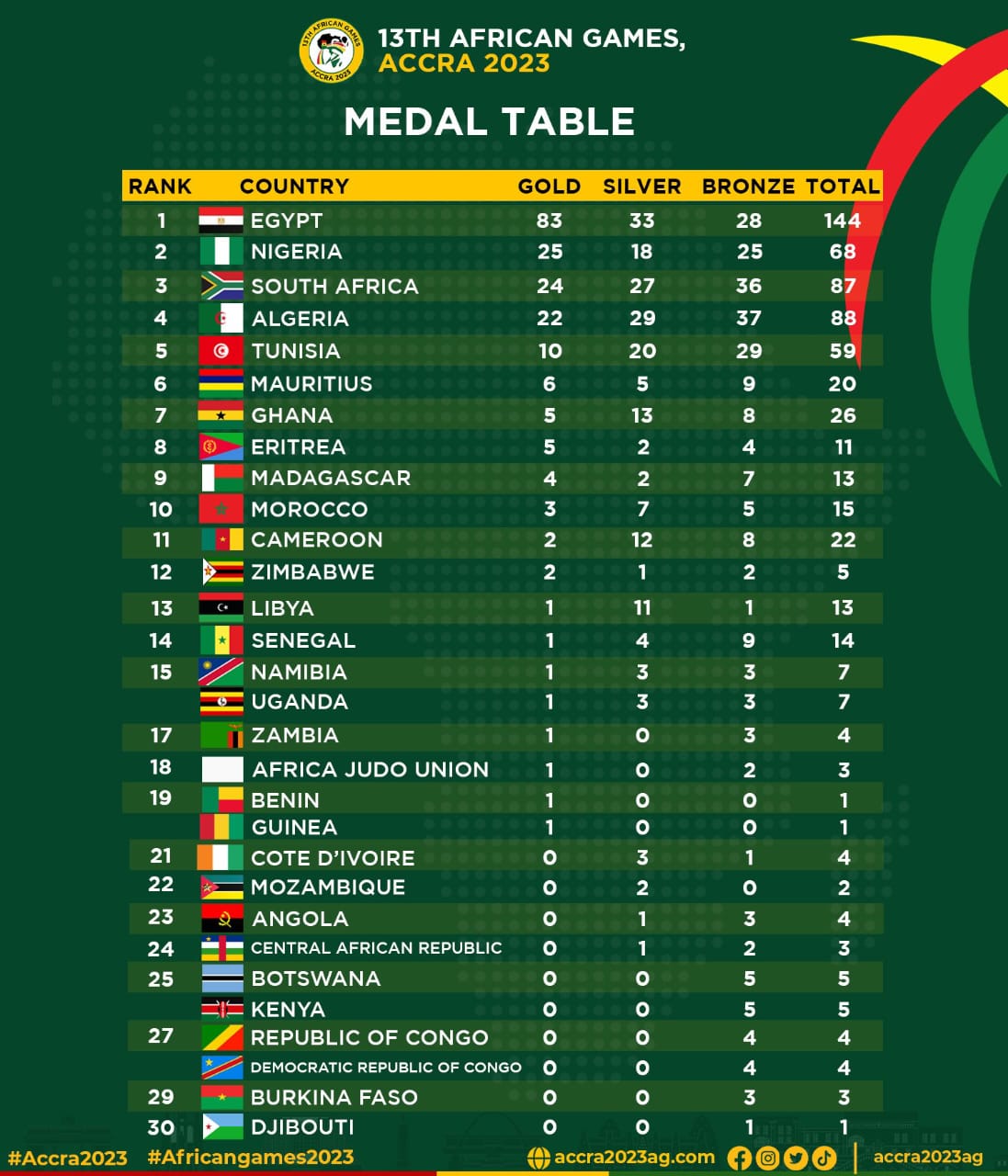 Team Nigeria’s remarkable performance at the ongoing 13th African Games has helped them secure the second spot in the medal standings.